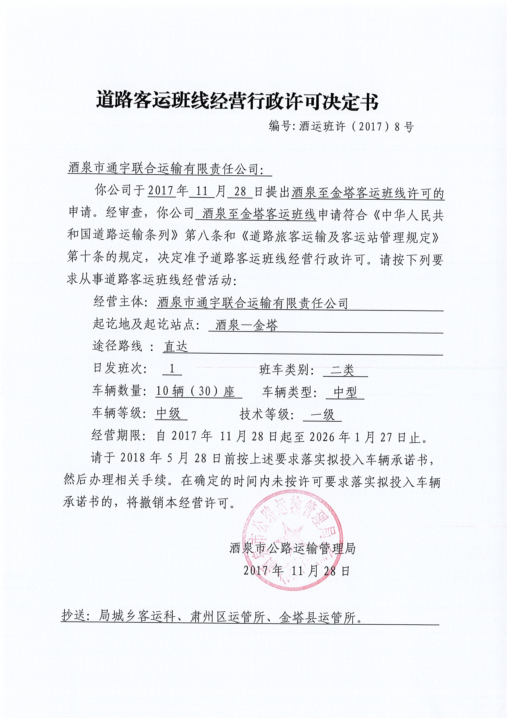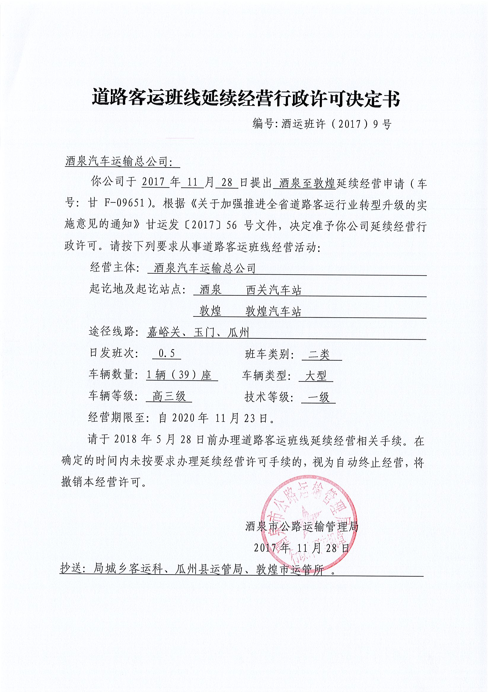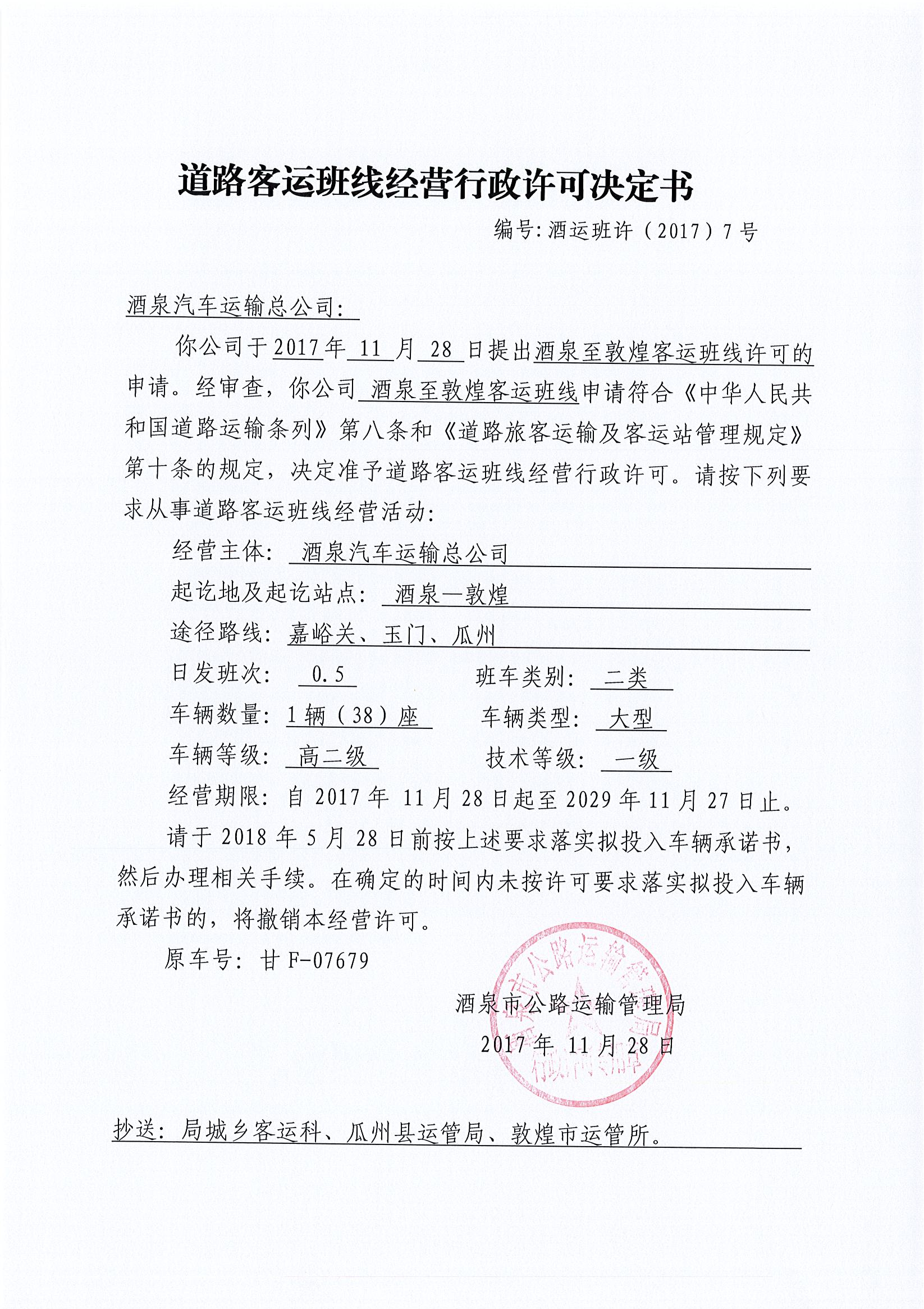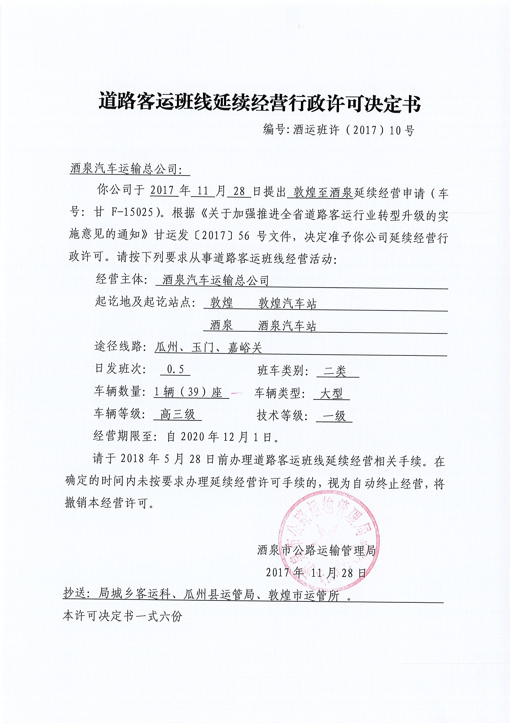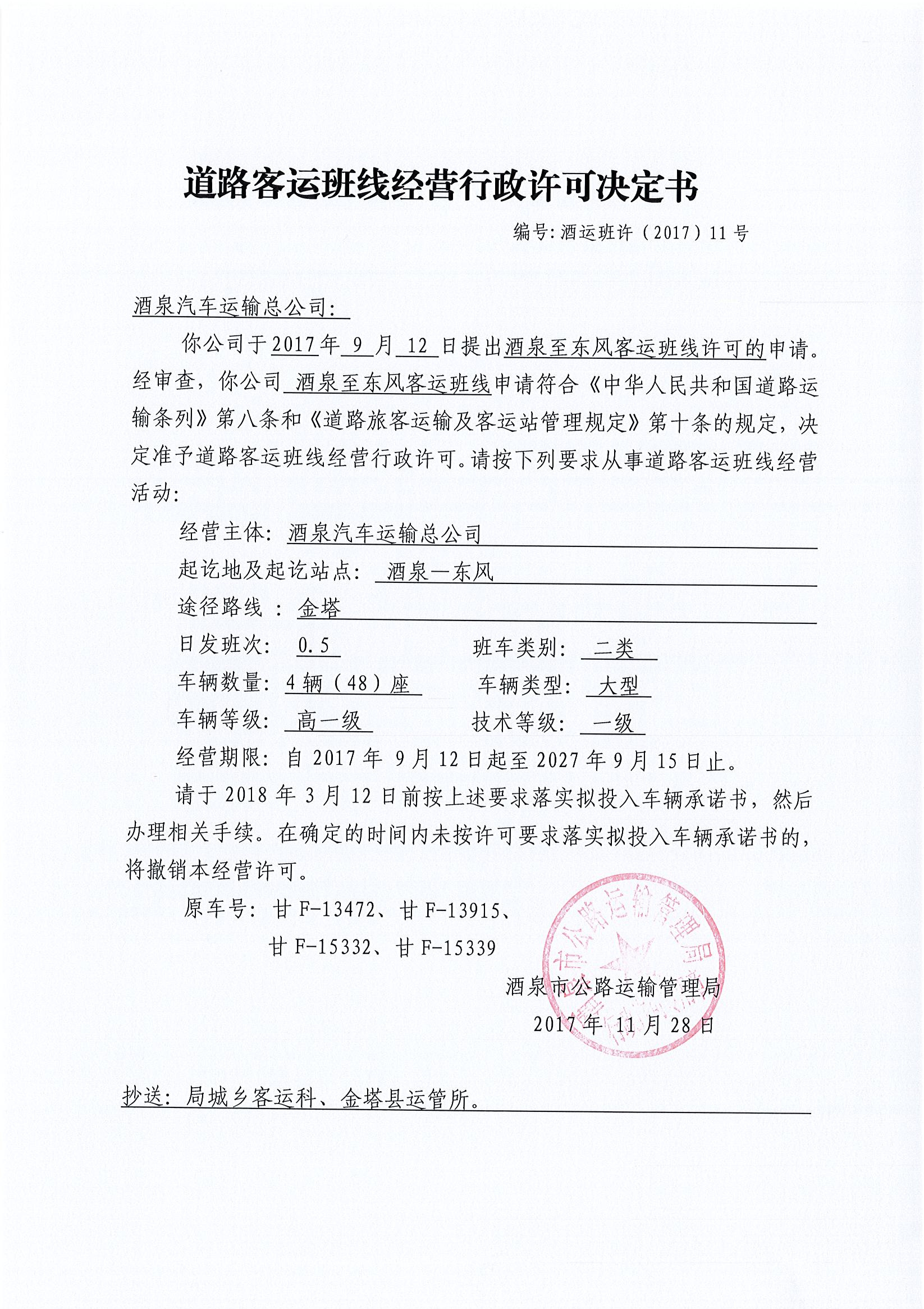 道路客运班线经营行政许可决定书