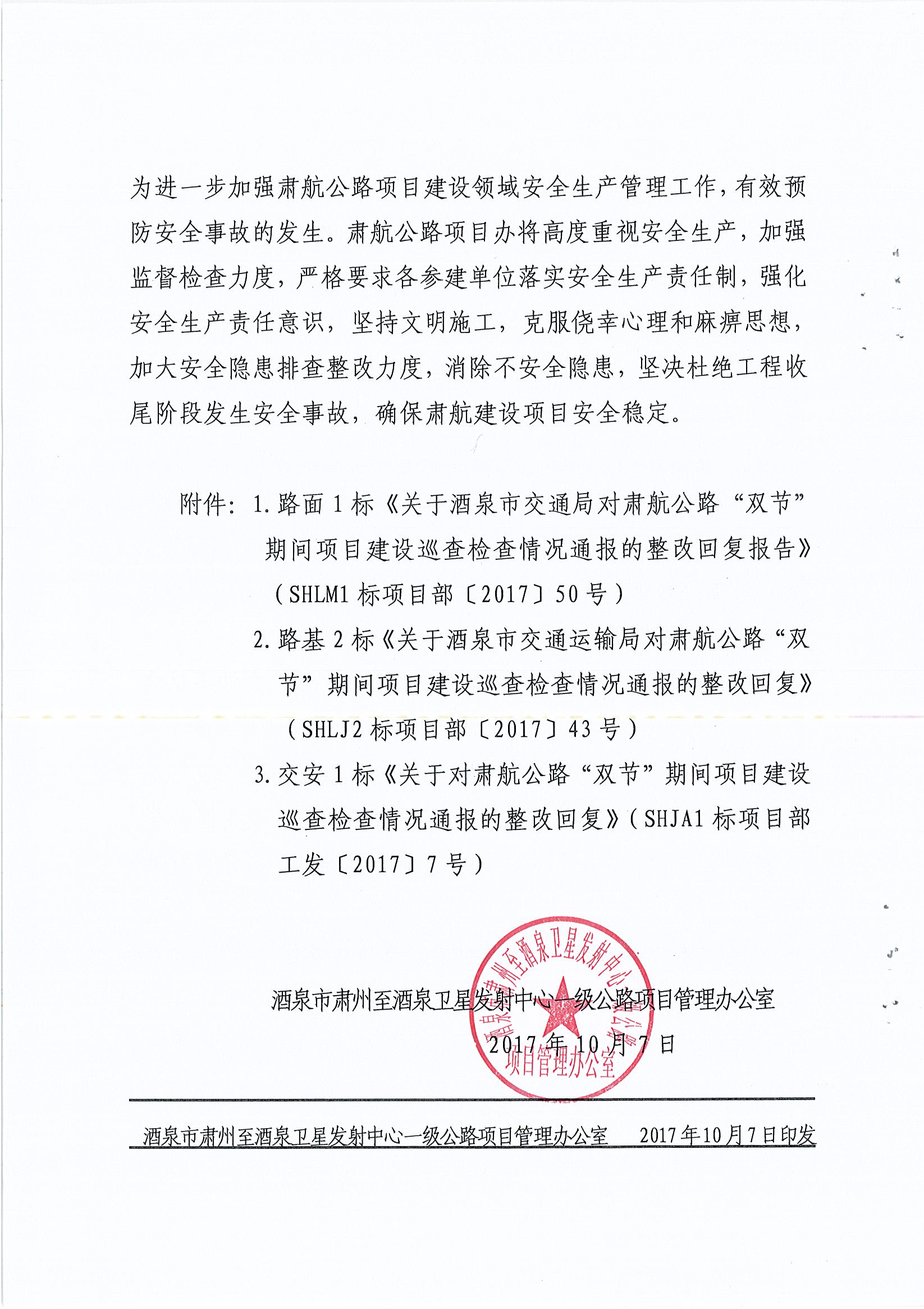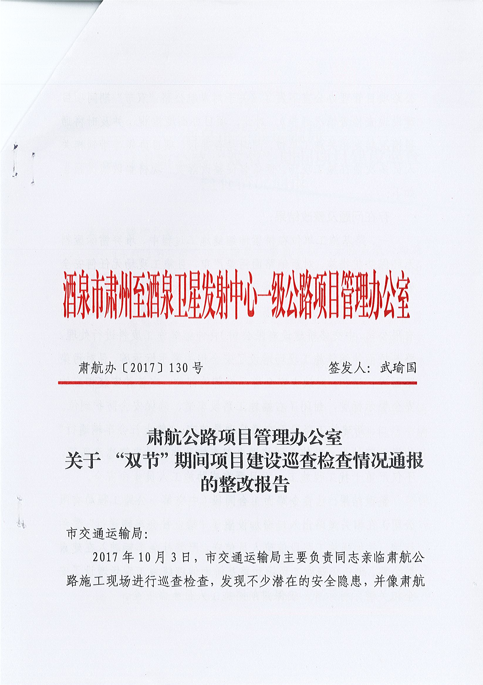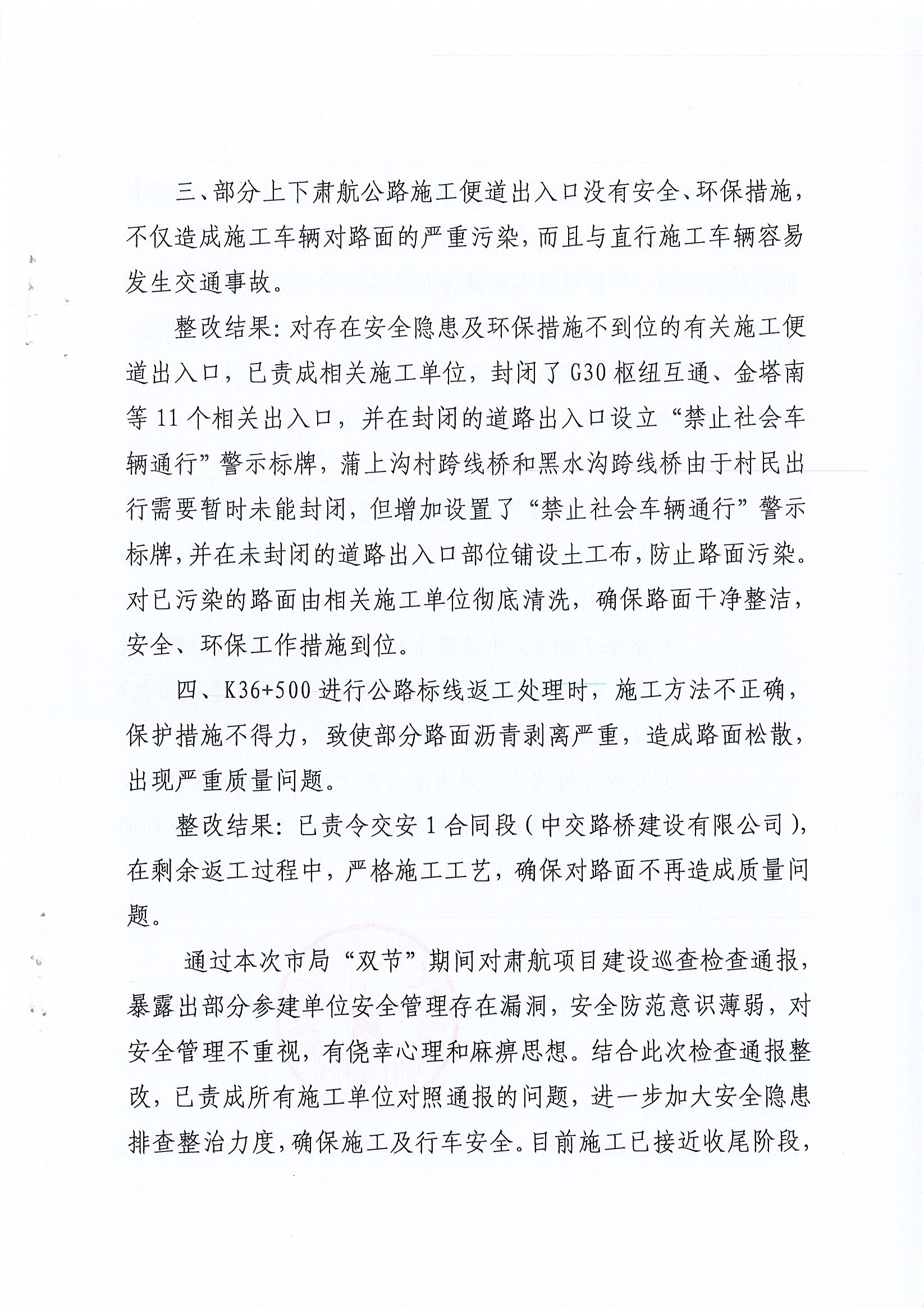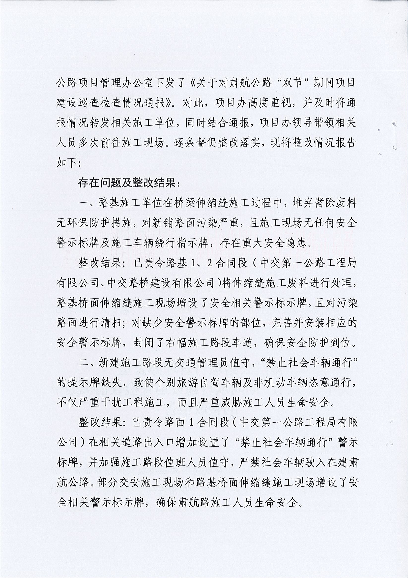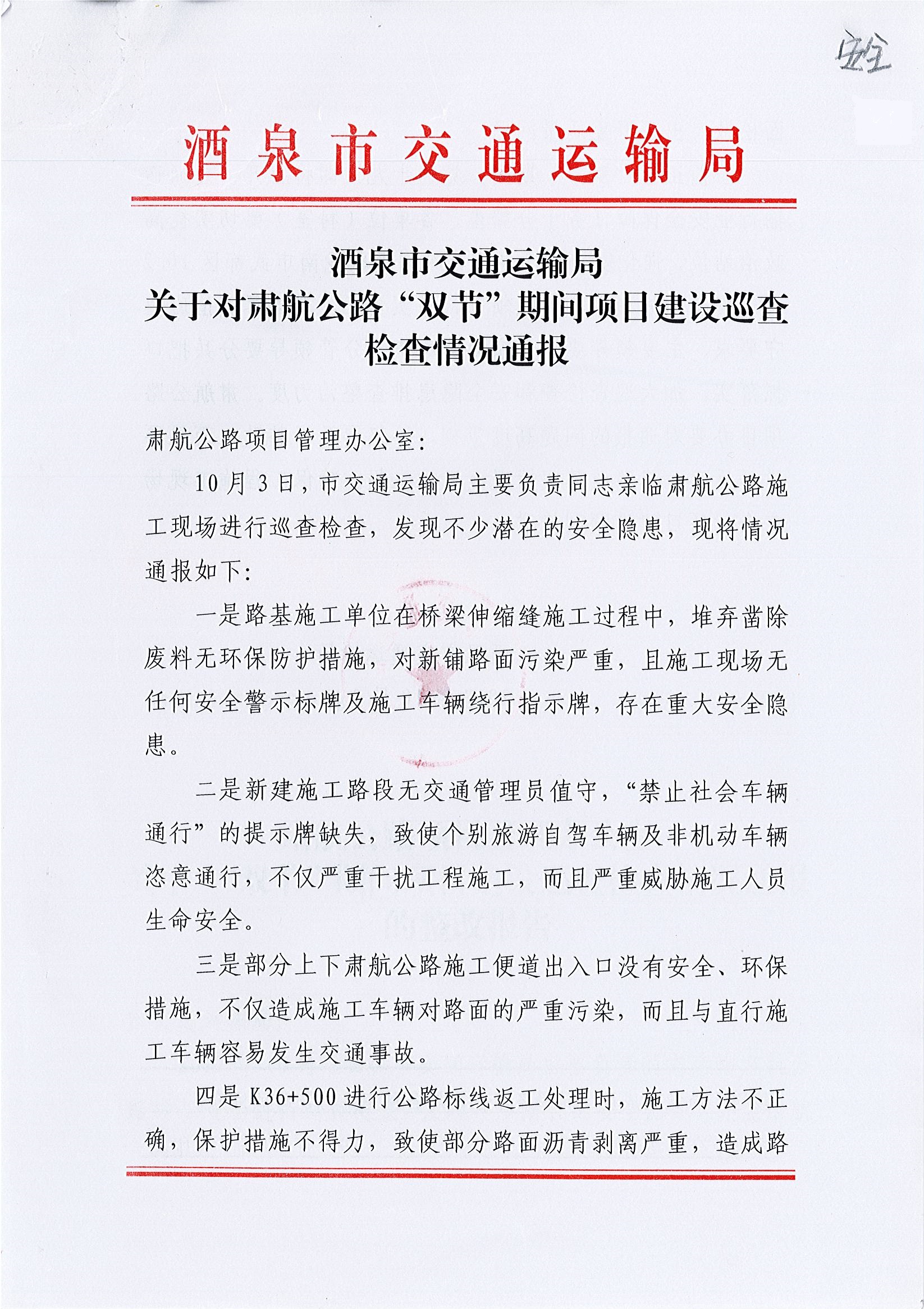 关于对肃航公路“双节”期间项目建设巡查检查情况通报