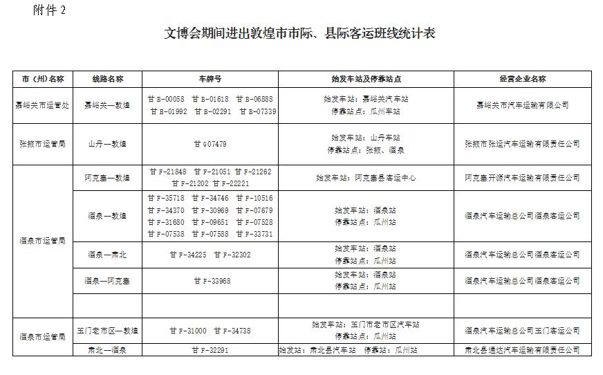 (三)强化客运班线管控。经申报核实,截止目前,敦煌开行到青海、新疆两省(区)和外省开行到敦煌的省际班线共有9条、18辆客车(详见附表1);嘉峪关、张掖、酒泉开行到敦煌市的市际、县际班线共有1 8条、71辆客车(详见附表2),起讫、停靠站点12个(详见附表3)。各县(市、区)要在9月15日前组织专门人员,深入相关运输企业,准确核实并上报《9月15—9月30日进敦煌客运车辆排班计划表》逐班、逐车建立每日进、出敦煌客运班线管理信息台账。